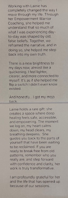 Through coaching, boundary-setting, emotional safety practices, deep identity shifts, and giving myself a permission slip to shed the layers of over people's shame I had absorbed and identified as my own, I rebuilt my life from the inside out- with confidence, assertiveness, emotional strength, and purpose.
